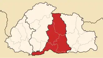 | Sud | ![]() | Bumthang Sarpang Trongsa Zhemgang | Geylegphug | 9 679 km2 | 260 000 |