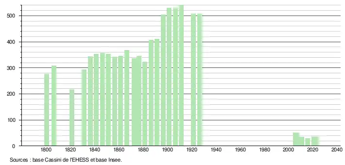 L'évolution du nombre d'habitants est connue à travers les recensements de la population effectués dans la commune depuis 1800. Pour les communes de moins de 10 000 habitants, une enquête de recensement portant sur toute la population est réalisée tous les cinq ans, les populations de référence des années intermédiaires étant quant à elles estimées par interpolation ou extrapolation[17]. Pour la commune, le premier recensement exhaustif entrant dans le cadre du nouveau dispositif a été réalisé en 2005[18].