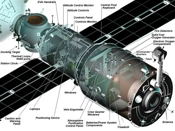 2 Quartiers d'habitation 2 moteurs 2,95 kN de poussée 14 hublots de 7 à 41 cm de diamètres Stations pour expériences Recyclage atmosphère Machines d'exercice physique |