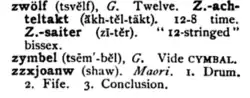 Il a figuré régulièrement dans plusieurs ouvrages d'étymologie et dans Music Lovers' Cyclopedia, de Rupert Hughes, où on le présentait comme le mot māori pour « tambour », alors que les sons correspondant à « z », à « x » et à « j » sont absents de cette langue polynésienne.